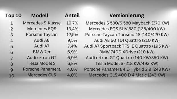 In der Oberklasse dominieren deutsche Hersteller wie Audi, BMW, Mercedes-Benz oder Porsche. Laut aktuellem Dataforce-Ranking kommen sie auf einen Marktanteil von mehr als 93 Prozent. Innerhalb der Top 10 liegt Mercedes mit drei Modellen und einem Marktanteil von 37,1 klar vorne, gefolgt von Audi, ebenfalls mit drei Modellen und einem Marktanteil von 23,8 Prozent. Porsche ist mit zwei Modellen vertreten und schafft damit 16,5 Prozent Marktanteil. Als einziges Importmodell ist das Tesla Model S mit 6,8 Prozent in der Top 10 auf Platz 8 vertreten.