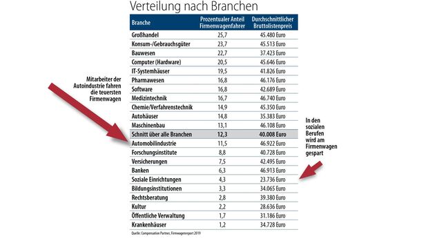 Besonders großzügig bedenken der Großhandel der Konsum- und Gebrauchsgüterindustrie sowie das Baugewerbe ihre Mitarbeiter mit Dienstwagen. Die wenigsten gibt es in Krankenhäusern sowie in der öffentlichen Verwaltung und bei Behörden; dort werden in der Regel nur Führungskräfte mobil gehalten.