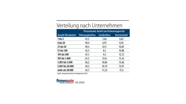Einen direkten Einfluss auf Preis und Verbreitung hat die Firmengröße. Je größer das Unternehmen, desto mehr Kollegen kommen in den Genuss eines Dienstwagens. Ähnlich ist es beim Fahrzeugwert: Bei Firmen mit fünf Mitarbeitern beträgt der Durchschnittspreis 27.000 Euro, 43.700 Euro dagegen sind es bei Unternehmen mit über 20.000 Mitarbeitern. Die Führungskräfte genehmigen sich logischerweise teurere Wagen: Der niedrigste Durchschnittspreis bei Kleinunternehmen liegt bei 48.000 Euro, der höchste bei großen Betrieben bei 56.000 Euro.