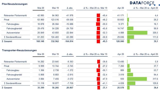 Minus 45,9 Prozent: Im Mai wurden in Deutschland nur halb so viele Pkw zugelassen wie im Vorjahresmonat. Doch laut Dataforce haben die Autohändelr und Vermieter wieder mehr Fahrzeuge zugelassen. Und da auch private Autokäufer wieder Chancen auf Termine bei den Zulassungsstellen haben, ging's auch dort aufwärts.