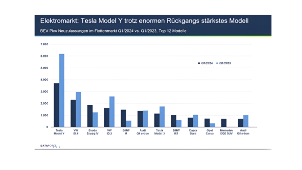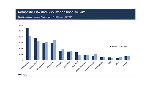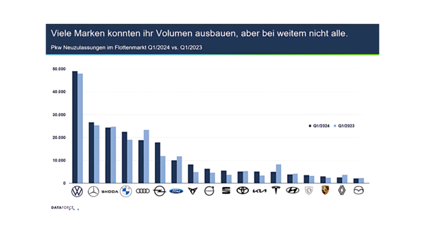 Auf dem Pkw-Flottenmarkt hat sich im Vergleich zum ersten Quartal des Vorjahres einiges getan. Hier die wichtigsten Insights von Dataforce-Experte Michael Gergen. Zum einen steigen die Neuzulassungen im ersten Quartal 2024 auf 233.998 Einheiten (plus 3 Prozent). Damit erreicht der Flottenmarkt sein bisher stärkstes Quartal. Insgesamt konnten viele Marken zulegen, aber längst nicht alle. Unangefochtene Nummer 1 bleibt VW, mit einigem Abstand folgen Mercedes, Skoda und BMW. Die Bayern haben damit Audi in der Rangliste der erfolgreichsten Flottenmarken überholt. Cupra hat sich mit einem Volumenzuwachs von 66 Prozent in den Top 10 etabliert. Auch Opel hat bisher ein starkes Jahr hinter sich. Eher schlecht sieht es dagegen für Tesla aus. Das Unternehmen ist im Ranking um fünf Plätze abgerutscht.