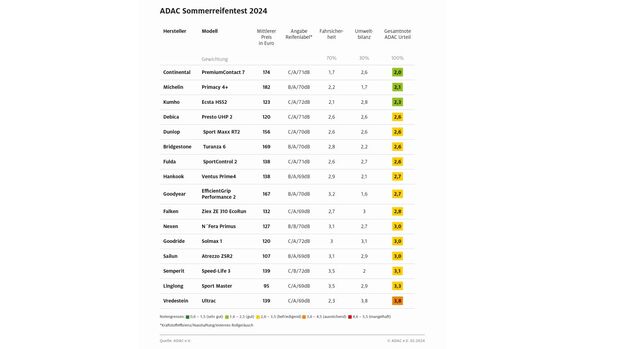 ADAC Sommerreifentest 2024: Fast alle empfehlenswert