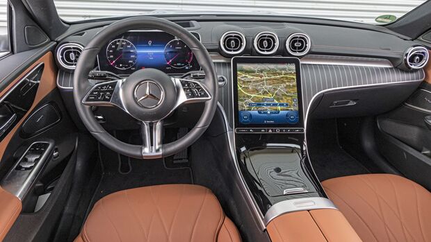 Den Innenraum-Look und die Bedienung prägt der große Touchscreen aus der S-Klasse. Statt OLED- steckt im C darin Flüssigkristalltechnik, die trotzdem eine brillante Darstellung erreicht. Einzig die nicht optimale Apple-Carplay-Skalierung nimmt der Schrift darin leicht die Schärfe.
