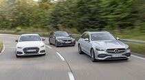 Wie bei den Rivalen elektrifiziert ein 48-Volt-System die C-Klasse, die selbst in der künftigen AMG-Version nur noch mit Vierzylindern antritt. Über eine ordentliche Laufkultur kommt der 300 d so nicht hinaus, doch obwohl ihm 21 PS und bis zu 100 Nm auf die Sechszylinder-Rivalen fehlen, sprintet er mit ihnen auf Augenhöhe. Die beiden aufgeweckten Turbos mit variabler Turbinengeometrie pressen 265 PS aus 1993 cm3, und der Motor verbraucht mit 6,9 l/100 km am wenigsten (BMW: 7,2 l, Audi: 7,8 l).