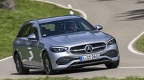 Aus dem Drehzahlkeller schiebt er souverän ohne Schaltvorgänge der Neungangautomatik an. Beim Ausrollen vor einer Ampel kommt es mitunter zu minimalen Rucken. Die verleiten den Fahrer, den Fuß leicht zu bewegen, was bei der Bremspedalabstimmung genügt, um die Bremsung ordentlich zu verstärken. Wie gesagt: Das kriegt man unter Kontrolle. Beim Fahren zeigt der C einen gekonnten Mix aus Tempo und Gelassenheit. Auf Dynamiker macht der etwas intensiver wankende 300 d nie. Außerdem gibt es diesen Motor weder mit Allradantrieb noch Sperrdifferenzial. Dafür passt die Komfortlenkung super. Sie filtert Straßenschäden effizient und gibt gleichzeitig wichtige Infos über den Straßenzustand deutlich weiter. Ein Sport-ESP lässt sich im Assistenzmenü aktivieren, das sich jedoch oft als Spielverderber erweist – etwa auf einem Flickenteppich in spitzen Kurven.