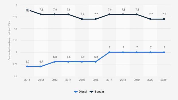 Der Durchschnittsverbrauch der in Deutschland zugelassenen Diesel hat sich zwischen 2011 und 2021 von 6,7 auf 7,0 Liter erhöht.
