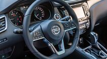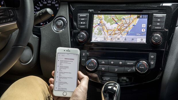 Auch beim Infotainment ist der Qashqai nicht mehr auf dem neuesten Stand. Zwar integriert das System aktuelle Smartphones gut, aber der kleine Bildschirm mit seinen unterdimensionierten Symbolen macht es schwer, immer direkt die richtige Schaltfläche zu treffen. Auch bei den Assistenzsystemen ist dem Qashqai bei der Angebotsstruktur sein Alter anzumerken: So gibt es zwar Spurhalte- und Abstandshalter, allerdings nur gegen Aufpreis in der teuren Tekna+-Ausstattung, die auch wenig dienstwagentaugliche 19-Zoll-Räder oder eine beheizbare Frontscheibe mitbringt. So mussten wir den toten Winkel ebenso selbst kontrollieren wie den Abstand zum Vordermann. Wurde es allzu knapp, warnte immerhin der Notbremsassistent vor der möglichen Gefahr.
