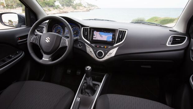 Wer im Baleno platznimmt und sich aufmerksam umschaut, wird einen Hauch Vitara zum Beispiel beim Enter- und Infotainment erkennen – etwa den identischen Touchscreen. In Sachen Sicherheit ist man auf der zeitlichen Höhe – so kann der Kleinwagen beispielsweise über einen aktiven Tempomat verfügen, der je nach Geschwindigkeit des Vordermanns selbsttätig bremst und beschleunigt. Die hinter dem großen Suzuki-Logo auf dem Kühlergrill geschickt versteckte Radar-Technik wird darüber hinaus für das autonome Bremssystem eingesetzt. Leider weder gegen Geld noch gute Worte zu Haben: LED-Hauptscheinwerfer. Immerhin gibt es Xenonlicht.