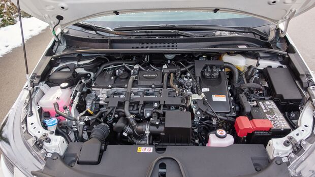 Der Swace ist also nicht nur auf den ersten Blick mit dem Toyota Corolla Touring Sports identisch, auch der zweite offenbart nur wenige Unterschiede. Im Motorraum ist das Toyota-Logo schnell gefunden, und das muss ja auch kein Nachteil sein. Denn Hybrid können die Erfinder des Prius nachweislich. Womit wir zur Wahl des Antriebs kommen, die beim Suzuki keine Qual ist. Es gibt nur den 98-PS-Benziner. Gemeinsam mit dem 73-PS-Elektromotor ergibt das 122 PS Systemleistung, das war’s an Auswahl.
