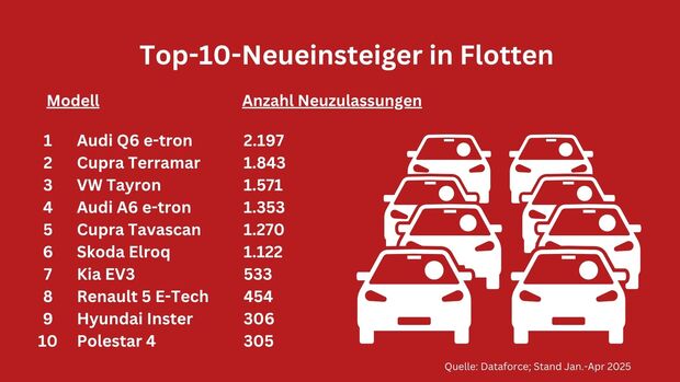 Audi, Cupra und VW dominieren das Neueinsteiger-Ranking im Flottenmarkt 2025 (Jan. - Apr.).