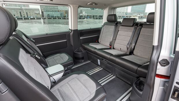 Im Lade- und Passagierraum hat sich hingegen wenig getan. Beim Multivan bleibt es beim bekannt praktischen Schienensystem. Es erlaubt eine freie Positionierung der massiven Dreier-Sitzbank und der drehbaren Einzelsitze, die ab der Ausstattung Comfortline Serie sind. Die Transporter profitieren von einer 230-Volt-Steckdose zum Nachladen von Akku-Werkzeug, einer abschließbaren Beifahrer-Doppelsitzbank sowie einer Unterladefunktion derselbigen. Lange Latten lassen sich also 40 Zentimeter weiter nach vorn unter den Beifahrersitz schieben. Außerdem ist nun auf Wunsch auch für die Heckflügeltür eine Rückfahrkamera erhältlich. Beim Caravelle bleibt im hinteren Abteil alles beim Gleichen.