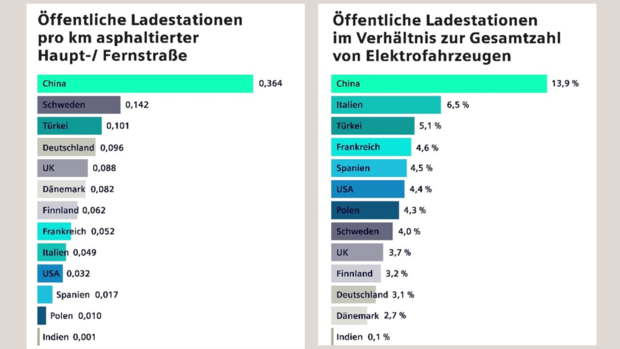 In fast allen untersuchten Regionen ist das Verhältnis von öffentlich zugänglichen Lademöglichkeiten zur Anzahl der E-Fahrzeuge und zur Straßeninfrastruktur gering. Nur China scheint ernsthafte Investitionen in das öffentliche Ladenetz getätigt zu haben. Währenddessen erreichen europäische Länder wie Großbritannien, Frankreich, Deutschland und Spanien nicht einmal die Hälfte der chinesischen Ladeinfrastruktur.