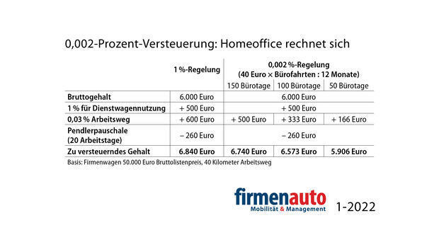 Wer oft im Homeoffice arbeitet, kann die Fahrten zwischen Wohnung und Arbeit statt pauschal mit 0,03 Prozent gemäß der 0,002-Prozent-Regel versteuern – sofern der Firmenwagen an weniger als 180 Tagen pro Jahr für die Fahrt zur Arbeit genutzt wird. Somit wird jede Fahrt einzeln besteuert. Bei einem 50.000 Euro teuren Geschäftswagen und 40 Kilometer Fahrtstrecke sind das pro Fahrt 40 Euro (0,002 Prozent vom Bruttolistenpreis = 1 Euro mal 40). Davon abgezogen wird die Entfernungspauschale von 13 Euro (20 Kilometer mit 0,30 Euro; 20 Kilometer mit 0,35 Euro). Bei weniger als 180 Fahrten pro Jahr oder monatlich unter 15 Fahrten kann sich der Wechsel von der 0,03-Prozent- zur 0,002-Prozent-Methode lohnen.